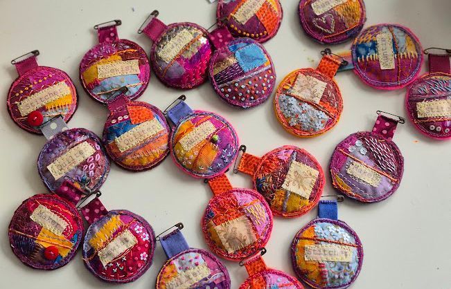 Learn how to make a scrap collage using small pieces of colourful fabrics and hand stitch. Cut into circles with a message, add a a strap and a pin to finish.